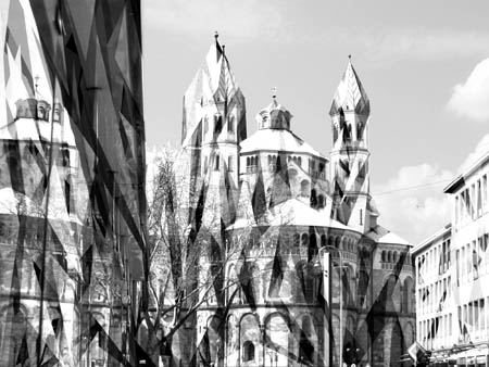 Die Serie Townscape Köln setzt sich mit architektonischen Motiven der Rhein-Metropole auseinander und thematisiert durch die Bearbeitung der fotografischen Aufnahme das Zusammenspiel unterschiedlicher Baustile im Stadtbild. Das von der Künstlerin entwickelte Fotocutup-Verfahren lässt durch die Schichtung unterschiedlicher Belichtungsebenen in Form von Dreiecken neue, mehrdimensionale Perspektiven entstehen und verbindet zugleich die teils auch im historischen Stil wieder aufgebauten Gebäude der Stadtlandschaft. Die Vielfalt der architektonischen Motive aus unterschiedlichen Jahrhunderten bleibt als solche erkennbar, und transformiert sich dennoch zu einer gleichsam transparenten, neuen, bildnerischen Gesamtform. | |||||||||||||||||||||||||||||||||||||||||||||