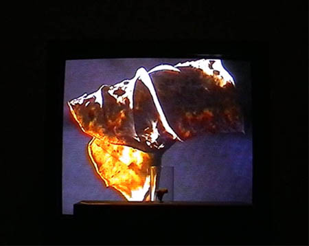 Ein kleines, unscheinbares, verdorrtes Blatt auf einem schmalen, schwarzen Sockel. Dahinter ein Monitor, dessen Bild dieses Blatt überdimensional wiedergibt. Neigt sich der Betrachter dem Blatt entgegen, lädt ihn die Aufschrift "leicht pusten" zu einer Aktion ein. Dadurch wird eine Klangkomposition aktiviert. Diese besteht aus einer Montage aus Originalton-Aufnahmen von Orkanen und Stürmen, sowie historischer Ereignisse und Reden seit dem Beginn des Radios. Wie ein Blatt im Wind, imaginär von einer Stelle zur nächsten getragen, begegnet es akustischen Fragmenten der Geschichte des 20.Jahrhunderts. |