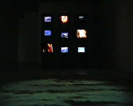 Elementary Landscape basiert auf Medientransformationen von Motiven der klassischen Vier Elemente. In ihr werden verschiedene (Wahrnehmungs-) Phänomene der Medienkunst thematisiert, miteinander verknüpft und in der Installation vergegenwärtigt. Die Vier Elemente werden in ihren vielfältigen Bedeutungen dabei nicht interpretiert, sondern eingesetzt als Grundmaterialien innerhalb einer komplexen, interaktiven Komposition. Für jedes Element wurde im visuellen wie im akustischen Bereich ein entsprechendes Motiv ausgewählt und in unterschiedlichen medienspezifischen Techniken behandelt und dargestellt. Die Installation besteht aus drei Säulen mit jeweils zwei kleinen und einem großen Monitor. Darauf zu sehen sind je eine Feuer - und zwei Wolken-Sequenzen. Die Monitor-Säulen sind Stelen vergleichbar, auf denen sich die Zeichen des Feuers und der Luft gleichsam "eingeschrieben" haben. Vor diesen Video-Säulen ist eine Fläche in Form eines Kreises mit weißer Erde bedeckt. Auf diese Oberfläche werden die bewegten Formen des Wassers als virtuelle Realität auf die unbewegte reale Materie des Elementes Erde projiziert. Begegnung von Fluidem, Immateriellem und fester Materie, von Wasser und Erde: eine elementare Landschaft, in die der Betrachter eintritt. Unter der Erde befindet sich ein "Klang-Teppich" mit vier nicht sichtbaren Sensor-Feldern. Jedes Feld ist einem der vier Elemente zugeordnet. Betritt man eines dieser Felder, wird eine von vier Klangkompositionen aktiviert, die auf Originalton-Aufnahmen der vier Elemente basieren. Sie sind jeweils über vier hängende Lautsprecher, wie ein Klangregen, zu hören. Beim Verlassen des Feldes verstummt die jeweilige Klang-Collage. Die vielfältigen audiovisuellen Motive der Installation evozieren im intermedialen Zusammenspiel bewußt gemachte Bewegung und Rhythmus, Erfahrung von Zeit und Transformation von Form und Farbe unterschiedlicher ästhetischer Gebilde und bildnerischer Erscheinungen. Es entstehen gleichsam neue elementare Landschaften. |