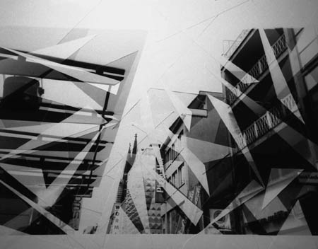 Fotografisch festgehaltene Perspektiven von Architekturen im Stadtbild von Köln bilden das Grundmotiv der Fotocutups. Diese basieren, im Unterschied zu den digital realisierten Bonner Fotoarbeiten, auf einem analogen Fotocutup-Verfahren. Dabei wurden Ausschnitte desselben Motivs in verschiedenen Belichtungen manuell geschnitten und übereinander collagiert. Durch eine erneute Ablichtung wurde diese Transformation wieder in ein fotografisches Bild zurückgeführt. | |||||||||||||||||||||||||||||||||||||||||||||