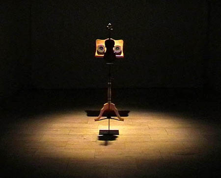 Eine Kinder-Violine ohne Geigenbogen auf einer schmalen schwarzen Stele. Davor ein Notenständer aus Holz mit zwei integrierten Lautsprechern. Nähert man sich der Installation, wird eine Klangkomposition aktiviert aus Zitaten klassischer Violinkonzerte und eines Geige spielenden Kindes verbunden mit Geräuschen der Fabrikation einer Violine. Der präparierte Notenständer als klangerzeugendes Instrument und Klangkörper zugleich, wird in seiner üblichen Funktion als Träger von Partituren und Notationen transformiert in ein Objekt technischer Reproduktion, in einen durch Lautsprecher klingenden TonTräger akustisch eingeschriebener, real wahrnehmbarer Klangschriften. Davor stehend, die Silent Violin, eine stumme Zuhörerin musikalischer Erinnerungen vergangenen Musizierens. |