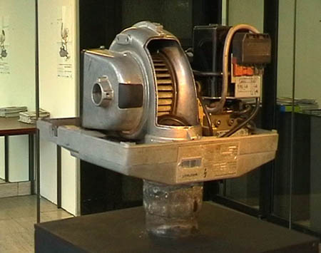 Das Klang-Objekt Corpus besteht aus einem stillgelegten Brenner, dem Herzstück einer Heizung. Thema dieser Arbeit: "Mensch und Maschine". Nähert man sich dem Klang-Objekt wird eine Klangkomposition per Sensor aktiviert. Sie besteht aus einer Collage von Originalton-Aufnahmen von Maschinen-, Herz- und Atmungsgeräuschen. Interaktiv kann der Betrachter zusätzlich den Motor durch einen Fußschalter in Bewegung setzen. Dadurch wird ein Rad, sichtbar im Innern der Maschine, geräuschvoll in Bewegung gesetzt. Dieses Rad erzeugt einen starken Windstrahl, der vom Betrachter auch körperlich wahrzunehmen ist. |